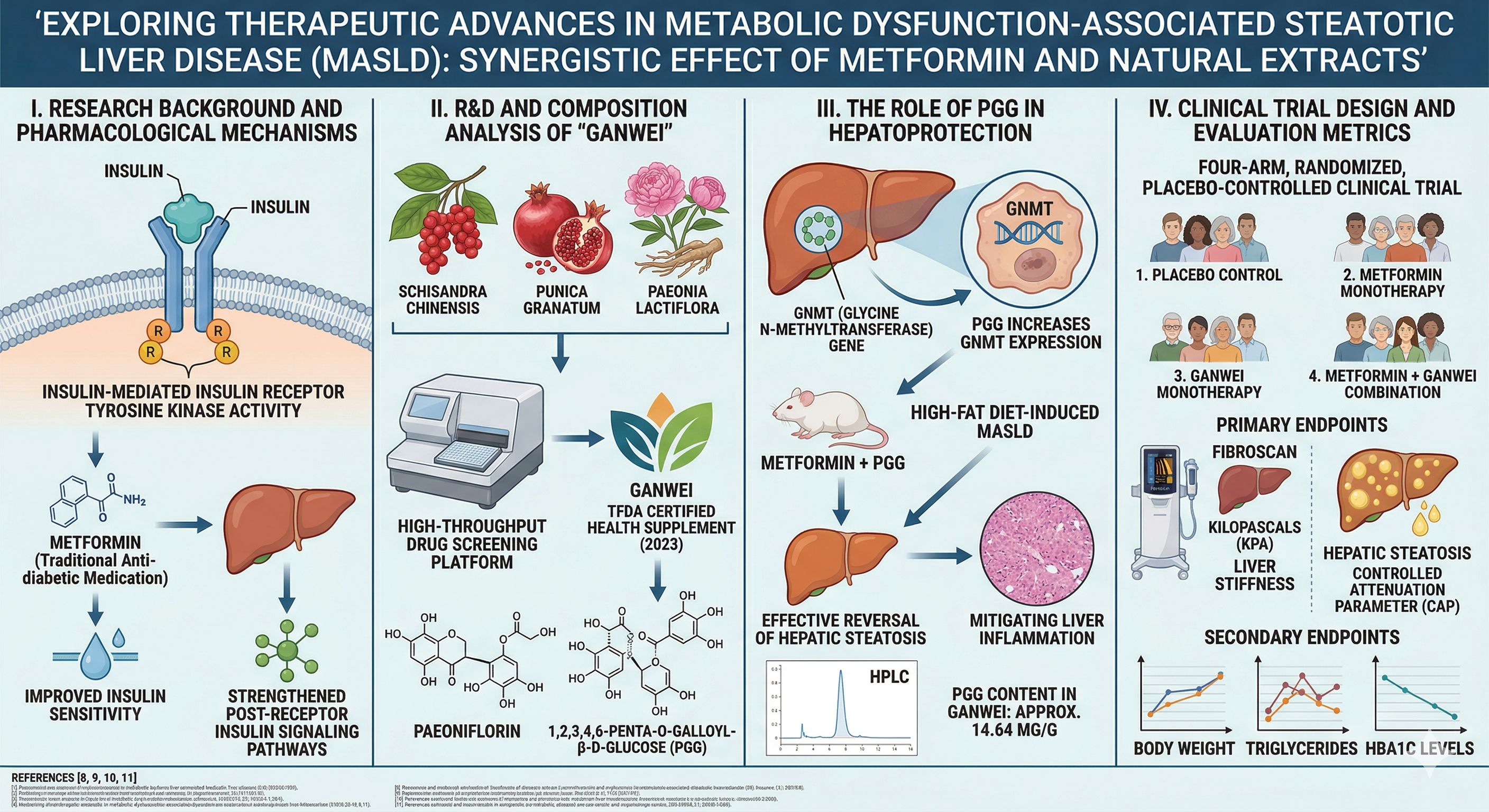 Based on the aforementioned research, a "four-arm, randomized, placebo-controlled" clinical trial has been initiated. The study aims to investigate the safety and efficacy of "Metformin monotherapy," "Ganwei monotherapy," and the "combination of both" in patients with MASLD.