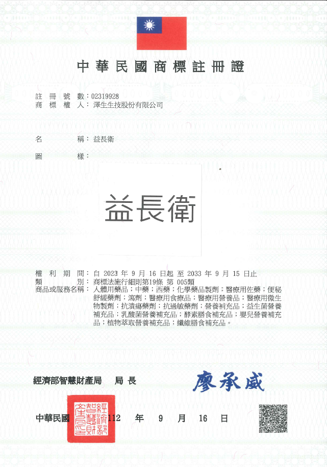 澤生生技「益長衛」獲得中國民國商標註冊證
