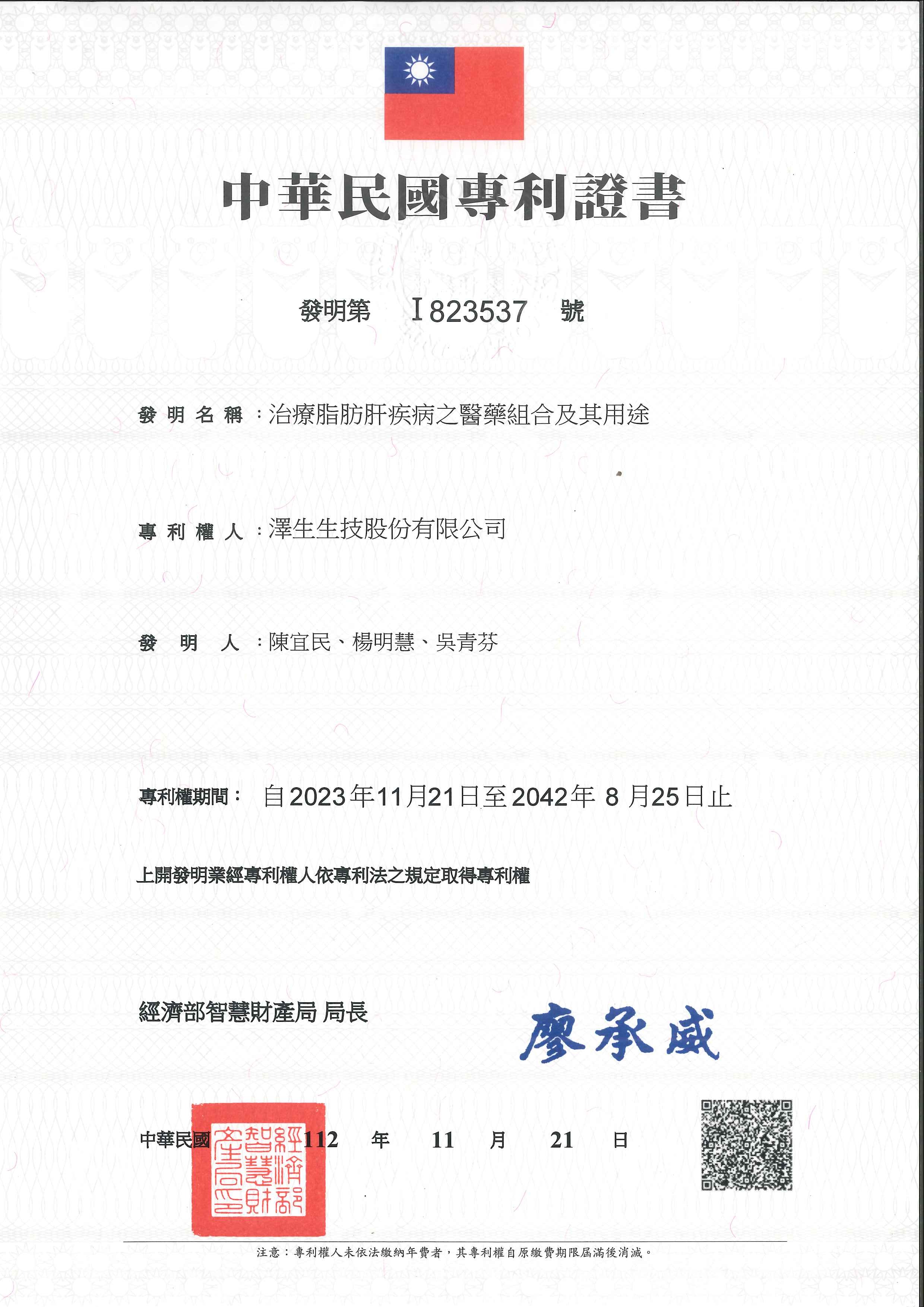 澤生生技「治療脂肪肝疾病之醫藥組合及其用途」獲得中華民國專利證書
