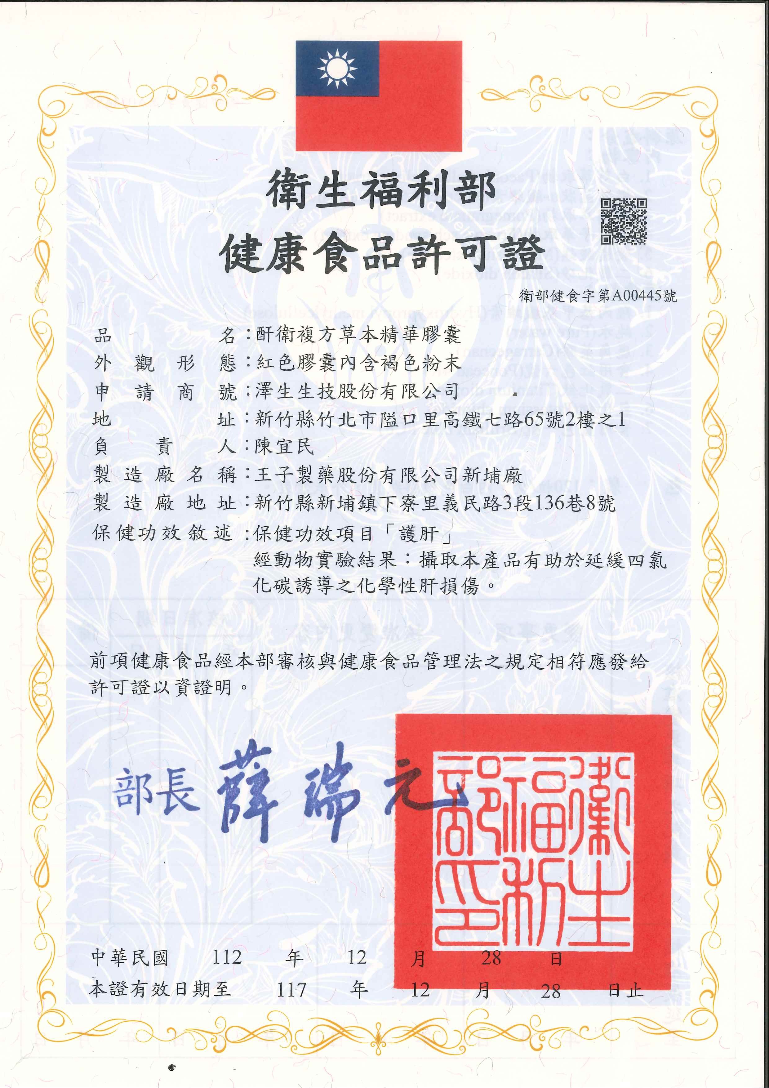 酐衛複方草本精華膠囊120粒 獲得健康食品認證健字號標章!