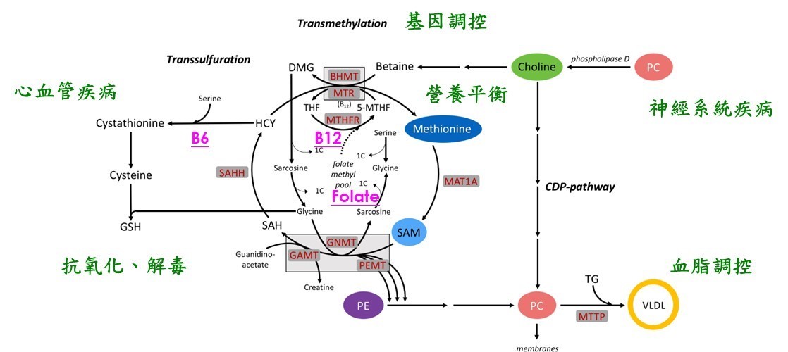 甘胺酸甲基轉化酶(Glycine-N-Methyltransferase, GNMT) 大概就是這樣的一個基因。在許多物種,包括植物,都可找到有類似基因序列且同樣功能的基因。這個基因在哺乳類動物扮演著很重要的角色,大家可以簡單的從下面的圖示可以發現。GNMT是Methionine cycle與folate (葉酸) cycle中重要的一個酵素,而這樣的循環的正常運作,會參與神經系統,心血管系統,血脂調節,抗氧化功能或解毒功能,更不用說,許多基因調控就是靠DNA被甲基化產生活化或抑制的結果。